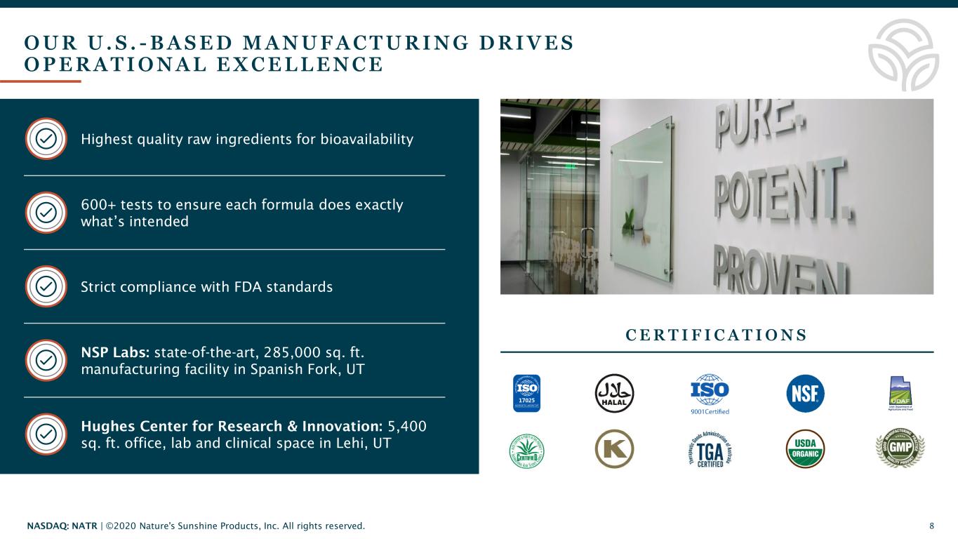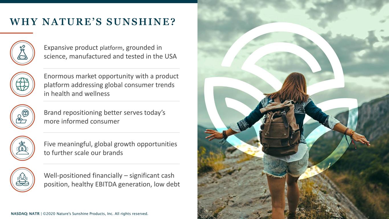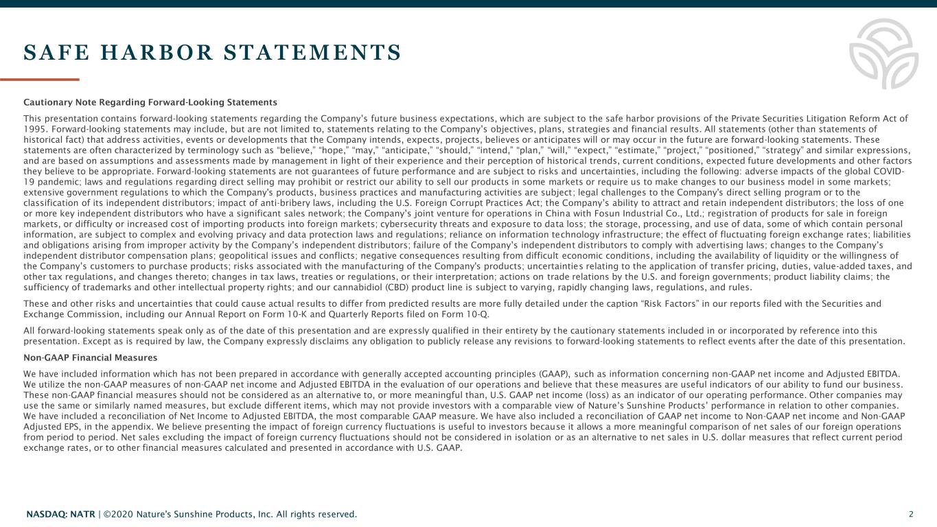 NASDAQ: NATR | ©2020 Nature's Sunshine Products, Inc. All rights reserved. 2 S A F E H A R B O R S T A T E M E N T S Cautionary Note Regarding Forward-Looking Statements This presentation contains forward-looking statements regarding the Company’s future business expectations, which are subject to the safe harbor provisions of the Private Securities Litigation Reform Act of 1995. Forward-looking statements may include, but are not limited to, statements relating to the Company’s objectives, plans, strategies and financial results. All statements (other than statements of historical fact) that address activities, events or developments that the Company intends, expects, projects, believes or anticipates will or may occur in the future are forward-looking statements. These statements are often characterized by terminology such as “believe,” “hope,” “may,” “anticipate,” “should,” “intend,” “plan,” “will,” “expect,” “estimate,” “project,” “positioned,” “strategy” and similar expressions, and are based on assumptions and assessments made by management in light of their experience and their perception of historical trends, current conditions, expected future developments and other factors they believe to be appropriate. Forward-looking statements are not guarantees of future performance and are subject to risks and uncertainties, including the following: adverse impacts of the global COVID- 19 pandemic; laws and regulations regarding direct selling may prohibit or restrict our ability to sell our products in some markets or require us to make changes to our business model in some markets; extensive government regulations to which the Company's products, business practices and manufacturing activities are subject; legal challenges to the Company's direct selling program or to the classification of its independent distributors; impact of anti-bribery laws, including the U.S. Foreign Corrupt Practices Act; the Company’s ability to attract and retain independent distributors; the loss of one or more key independent distributors who have a significant sales network; the Company’s joint venture for operations in China with Fosun Industrial Co., Ltd.; registration of products for sale in foreign markets, or difficulty or increased cost of importing products into foreign markets; cybersecurity threats and exposure to data loss; the storage, processing, and use of data, some of which contain personal information, are subject to complex and evolving privacy and data protection laws and regulations; reliance on information technology infrastructure; the effect of fluctuating foreign exchange rates; liabilities and obligations arising from improper activity by the Company’s independent distributors; failure of the Company’s independent distributors to comply with advertising laws; changes to the Company’s independent distributor compensation plans; geopolitical issues and conflicts; negative consequences resulting from difficult economic conditions, including the availability of liquidity or the willingness of the Company’s customers to purchase products; risks associated with the manufacturing of the Company's products; uncertainties relating to the application of transfer pricing, duties, value-added taxes, and other tax regulations, and changes thereto; changes in tax laws, treaties or regulations, or their interpretation; actions on trade relations by the U.S. and foreign governments; product liability claims; the sufficiency of trademarks and other intellectual property rights; and our cannabidiol (CBD) product line is subject to varying, rapidly changing laws, regulations, and rules. These and other risks and uncertainties that could cause actual results to differ from predicted results are more fully detailed under the caption “Risk Factors” in our reports filed with the Securities and Exchange Commission, including our Annual Report on Form 10-K and Quarterly Reports filed on Form 10-Q. All forward-looking statements speak only as of the date of this presentation and are expressly qualified in their entirety by the cautionary statements included in or incorporated by reference into this presentation. Except as is required by law, the Company expressly disclaims any obligation to publicly release any revisions to forward-looking statements to reflect events after the date of this presentation. Non-GAAP Financial Measures We have included information which has not been prepared in accordance with generally accepted accounting principles (GAAP), such as information concerning non-GAAP net income and Adjusted EBITDA. We utilize the non-GAAP measures of non-GAAP net income and Adjusted EBITDA in the evaluation of our operations and believe that these measures are useful indicators of our ability to fund our business. These non-GAAP financial measures should not be considered as an alternative to, or more meaningful than, U.S. GAAP net income (loss) as an indicator of our operating performance. Other companies may use the same or similarly named measures, but exclude different items, which may not provide investors with a comparable view of Nature’s Sunshine Products’ performance in relation to other companies. We have included a reconciliation of Net Income to Adjusted EBITDA, the most comparable GAAP measure. We have also included a reconciliation of GAAP net income to Non-GAAP net income and Non-GAAP Adjusted EPS, in the appendix. We believe presenting the impact of foreign currency fluctuations is useful to investors because it allows a more meaningful comparison of net sales of our foreign operations from period to period. Net sales excluding the impact of foreign currency fluctuations should not be considered in isolation or as an alternative to net sales in U.S. dollar measures that reflect current period exchange rates, or to other financial measures calculated and presented in accordance with U.S. GAAP.