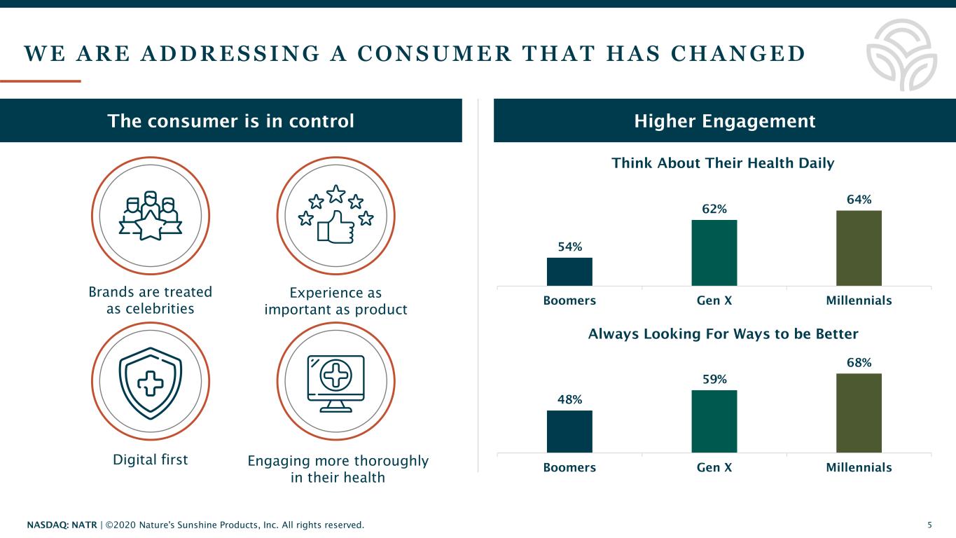 NASDAQ: NATR | ©2020 Nature's Sunshine Products, Inc. All rights reserved. 4 N A T U R E ’ S S U N S H I N E FEEL THE POWER… Nature’s Sunshine changed the world ~50 years ago as the first company to put herbs into easy-to-take capsules We sell 600+ products across seven different categories around the world Sophisticated in-house R&D capabilities via owned Hughes Center for Research & Innovation We manufacture most of our products in the U.S., ensuring optimal quality and safety We are executing a brand pivot supported by important consumer lifestyle changes