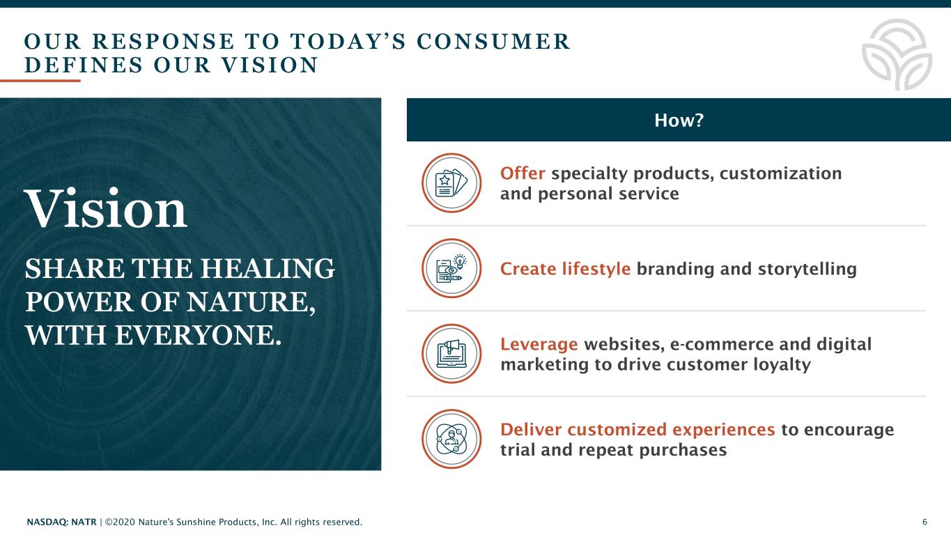 NASDAQ: NATR | ©2020 Nature's Sunshine Products, Inc. All rights reserved. 5 W E A R E A D D R E S S I N G A C O N S U M E R T H A T H A S C H A N G E D The consumer is in control Brands are treated as celebrities Experience as important as product Digital first Engaging more thoroughly in their health Higher Engagement 54% 62% 64% Boomers Gen X Millennials 48% 59% 68% Boomers Gen X Millennials Think About Their Health Daily Always Looking For Ways to be Better