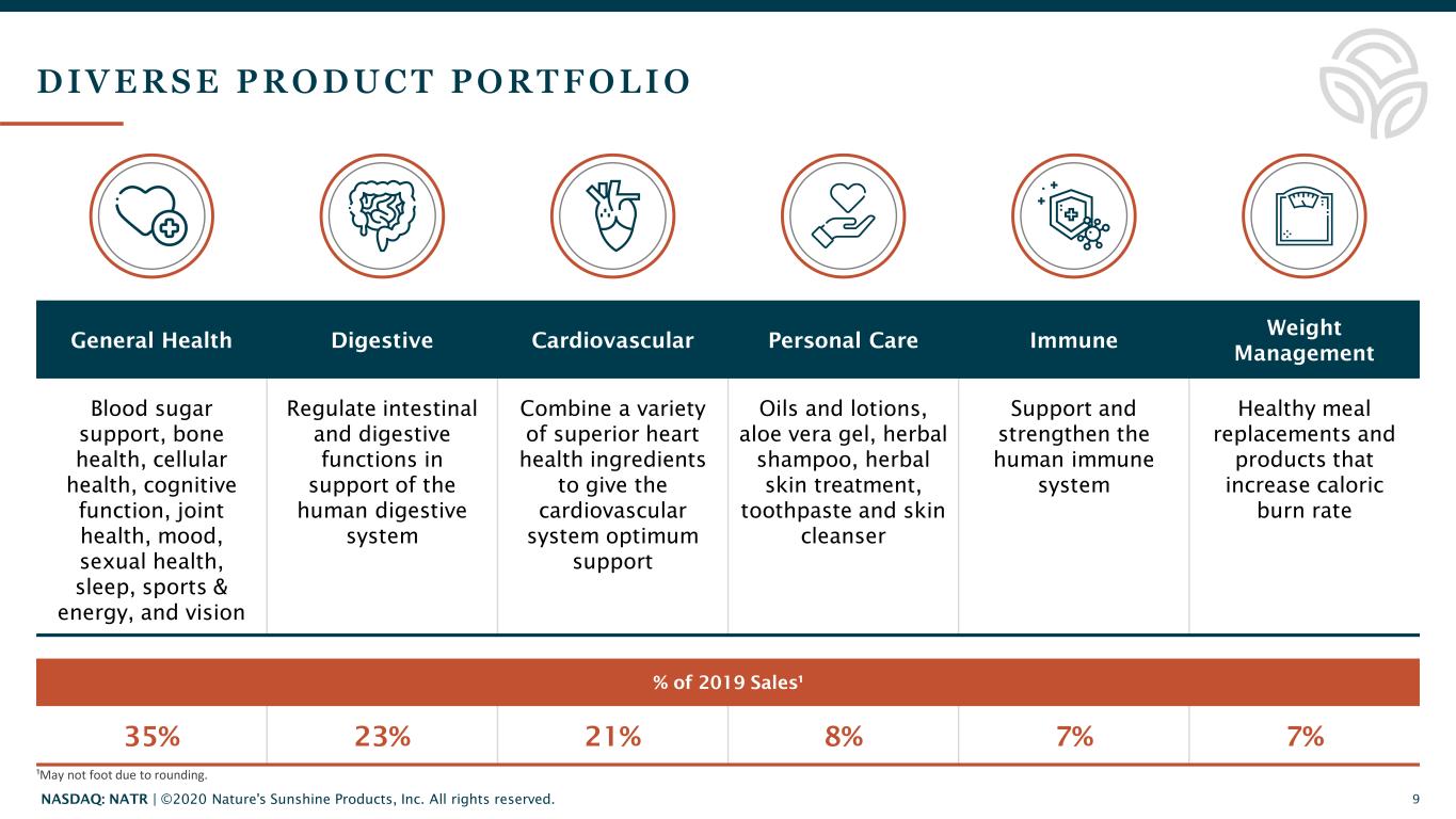 NASDAQ: NATR | ©2020 Nature's Sunshine Products, Inc. All rights reserved. 8 O U R U . S . - B A S E D M A N U F A C T U R I N G D R I V E S O P E R A T I O N A L E X C E L L E N C E C E R T I F I C A T I O N S Highest quality raw ingredients for bioavailability 600+ tests to ensure each formula does exactly what’s intended Strict compliance with FDA standards NSP Labs: state-of-the-art, 285,000 sq. ft. manufacturing facility in Spanish Fork, UT Hughes Center for Research & Innovation: 5,400 sq. ft. office, lab and clinical space in Lehi, UT