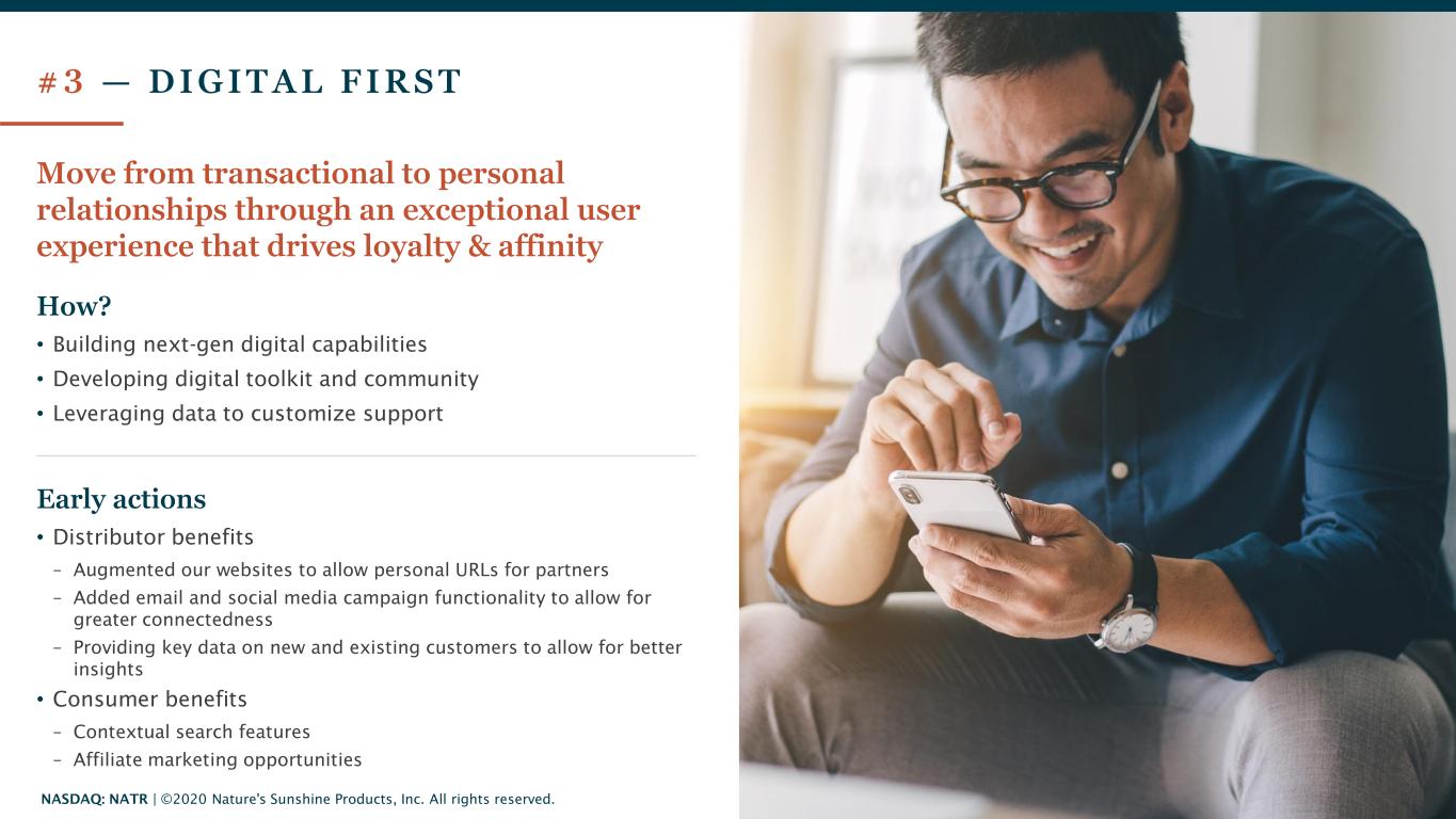 NASDAQ: NATR | ©2020 Nature's Sunshine Products, Inc. All rights reserved. 18 # 3 — D I G I T A L F I R S T Move from transactional to personal relationships through an exceptional user experience that drives loyalty & affinity How? • Building next-gen digital capabilities • Developing digital toolkit and community • Leveraging data to customize support Early actions • Distributor benefits – Augmented our websites to allow personal URLs for partners – Added email and social media campaign functionality to allow for greater connectedness – Providing key data on new and existing customers to allow for better insights • Consumer benefits – Contextual search features – Affiliate marketing opportunities