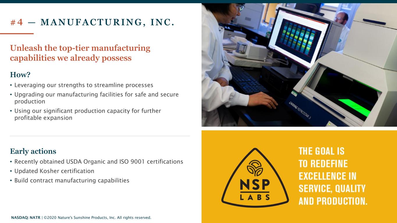 NASDAQ: NATR | ©2020 Nature's Sunshine Products, Inc. All rights reserved. 21 # 4 — M A N U F A C T U R I N G , I N C . Unleash the top-tier manufacturing capabilities we already possess How? • Leveraging our strengths to streamline processes • Upgrading our manufacturing facilities for safe and secure production • Using our significant production capacity for further profitable expansion Early actions • Recently obtained USDA Organic and ISO 9001 certifications • Updated Kosher certification • Build contract manufacturing capabilities
