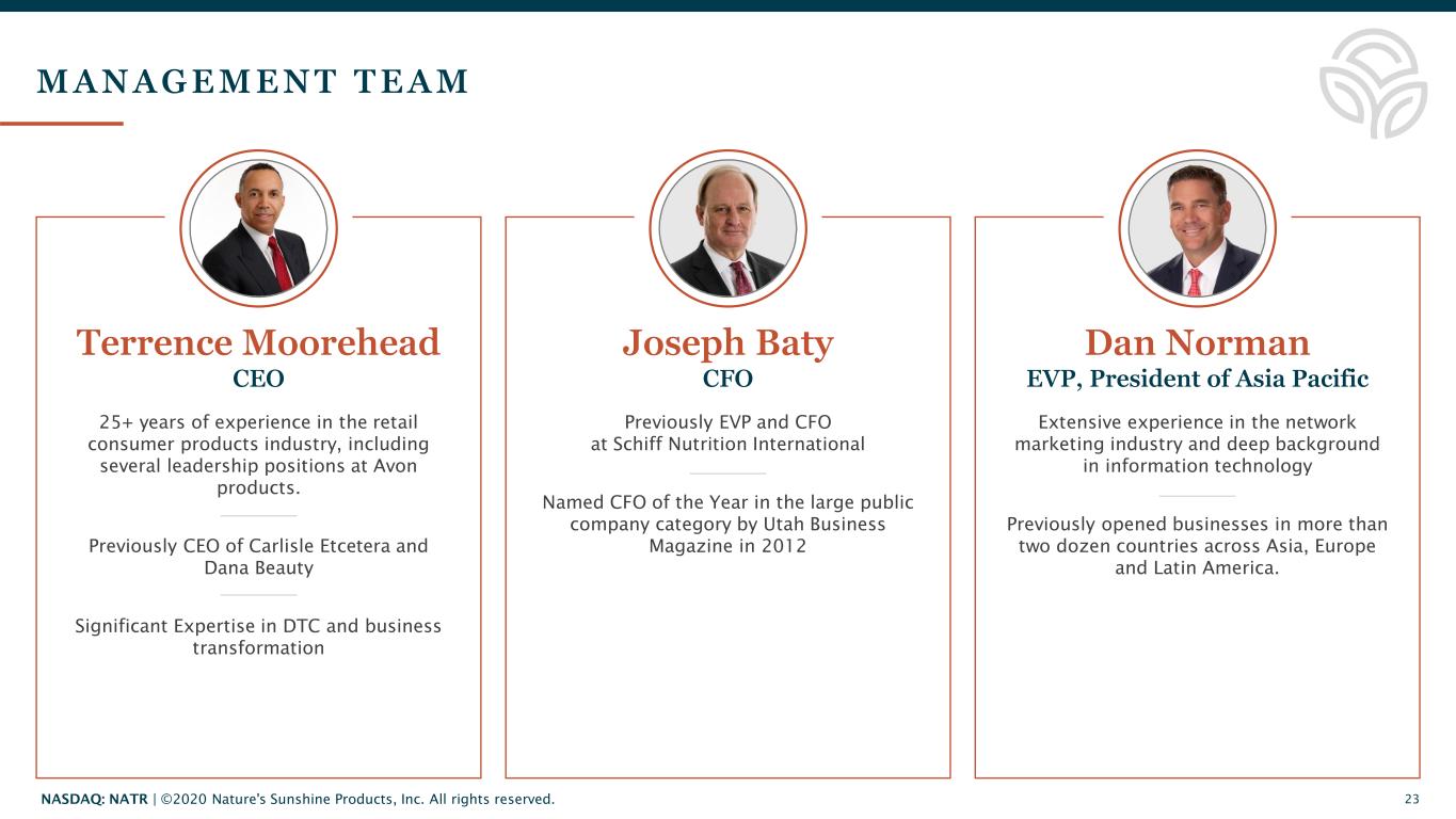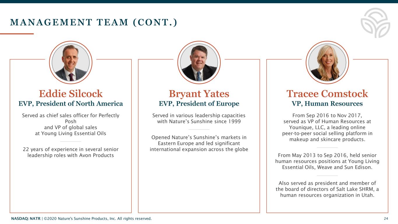 NASDAQ: NATR | ©2020 Nature's Sunshine Products, Inc. All rights reserved. 23 M A N A G E M E N T T E A M Dan Norman EVP, President of Asia Pacific Extensive experience in the network marketing industry and deep background in information technology Previously opened businesses in more than two dozen countries across Asia, Europe and Latin America. Joseph Baty CFO Previously EVP and CFO at Schiff Nutrition International Named CFO of the Year in the large public company category by Utah Business Magazine in 2012 Terrence Moorehead CEO 25+ years of experience in the retail consumer products industry, including several leadership positions at Avon products. Previously CEO of Carlisle Etcetera and Dana Beauty Significant Expertise in DTC and business transformation