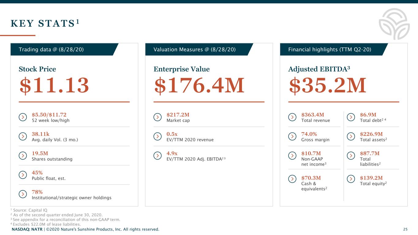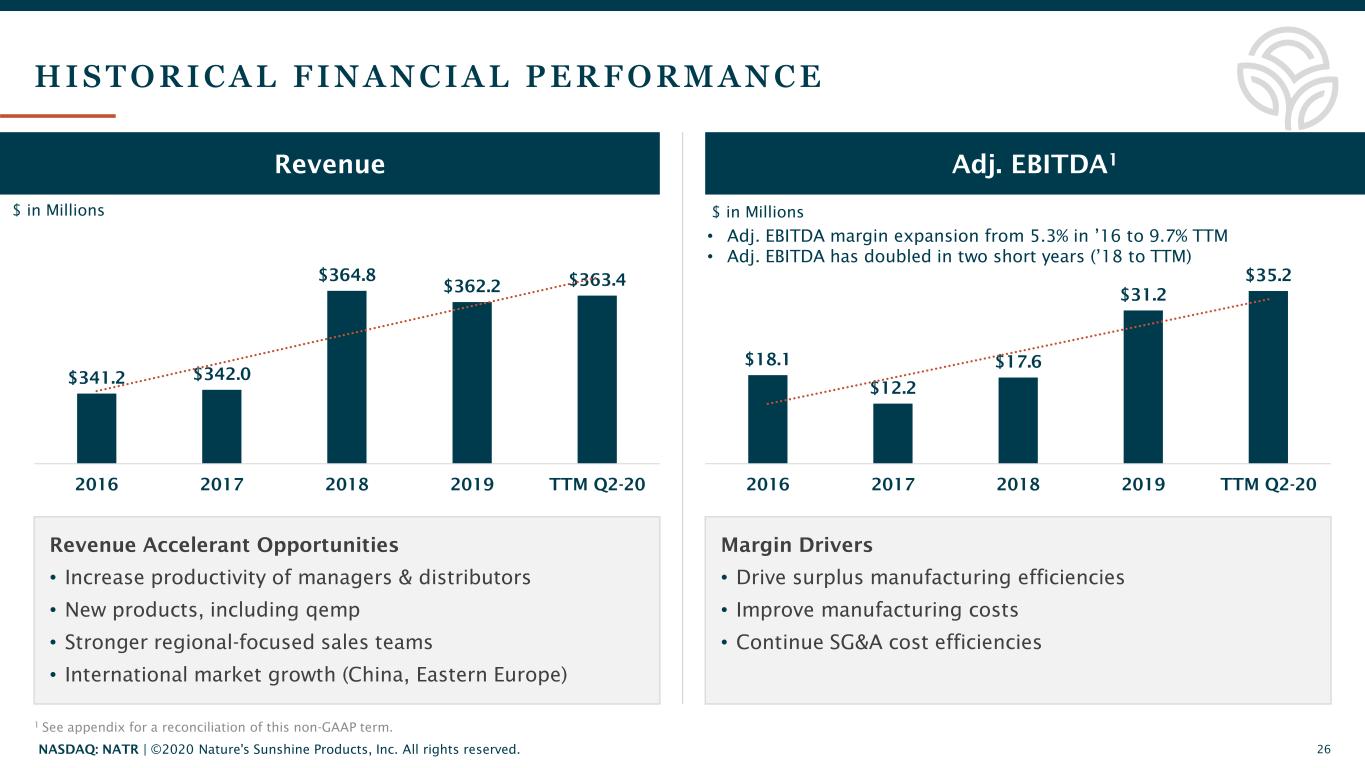 NASDAQ: NATR | ©2020 Nature's Sunshine Products, Inc. All rights reserved. 25 K E Y S T A T S 1 1 Source: Capital IQ 2 As of the second quarter ended June 30, 2020. 3 See appendix for a reconciliation of this non-GAAP term. 4 Excludes $22.0M of lease liabilities. Trading data @ (8/28/20) Valuation Measures @ (8/28/20) Financial highlights (TTM Q2-20) Stock Price $11.13 $5.50/$11.72 52 week low/high 38.11k Avg. daily Vol. (3 mo.) 19.5M Shares outstanding 45% Public float, est. 78% Institutional/strategic owner holdings Enterprise Value $176.4M $217.2M Market cap 0.5x EV/TTM 2020 revenue 4.9x EV/TTM 2020 Adj. EBITDA 2 3 Adjusted EBITDA3 $35.2M $363.4M Total revenue 74.0% Gross margin $10.7M Non-GAAP net income 3 $70.3M Cash & equivalents 2 $6.9M Total debt 2 4 $226.9M Total assets 2 $87.7M Total liabilities 2 $139.2M Total equity 2