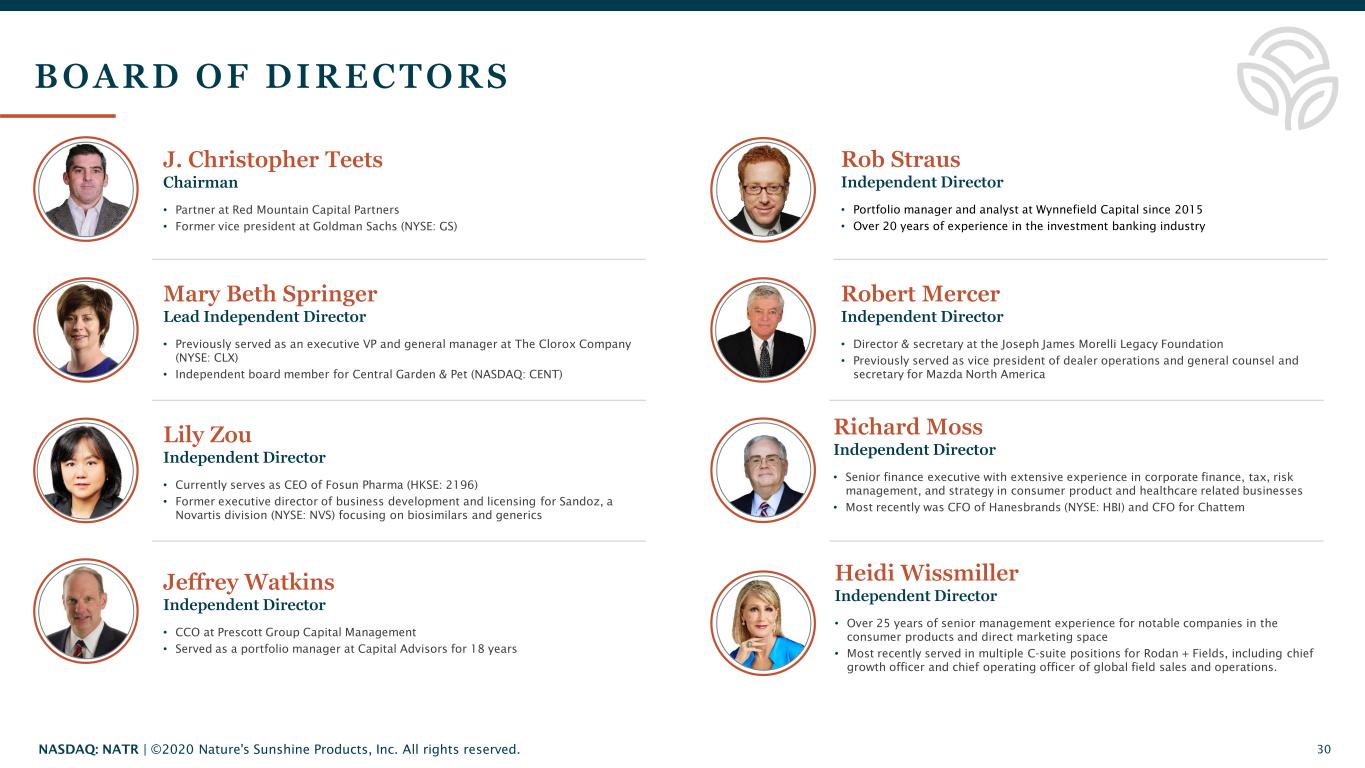 NASDAQ: NATR | ©2020 Nature's Sunshine Products, Inc. All rights reserved. 30 B OA R D OF DI R EC TOR S J. Christopher Teets Chairman • Partner at Red Mountain Capital Partners • Former vice president at Goldman Sachs (NYSE: GS) Mary Beth Springer Lead Independent Director • Previously served as an executive VP and general manager at The Clorox Company (NYSE: CLX) • Independent board member for Central Garden & Pet (NASDAQ: CENT) Richard Moss Independent Director • Senior finance executive with extensive experience in corporate finance, tax, risk management, and strategy in consumer product and healthcare related businesses • Most recently was CFO of Hanesbrands (NYSE: HBI) and CFO for Chattem Lily Zou Independent Director • Currently serves as CEO of Fosun Pharma (HKSE: 2196) • Former executive director of business development and licensing for Sandoz, a Novartis division (NYSE: NVS) focusing on biosimilars and generics Jeffrey Watkins Independent Director • CCO at Prescott Group Capital Management • Served as a portfolio manager at Capital Advisors for 18 years Robert Mercer Independent Director • Director & secretary at the Joseph James Morelli Legacy Foundation • Previously served as vice president of dealer operations and general counsel and secretary for Mazda North America Rob Straus Independent Director • Portfolio manager and analyst at Wynnefield Capital since 2015 • Over 20 years of experience in the investment banking industry Heidi Wissmiller Independent Director • Over 25 years of senior management experience for notable companies in the consumer products and direct marketing space • Most recently served in multiple C-suite positions for Rodan + Fields, including chief growth officer and chief operating officer of global field sales and operations.