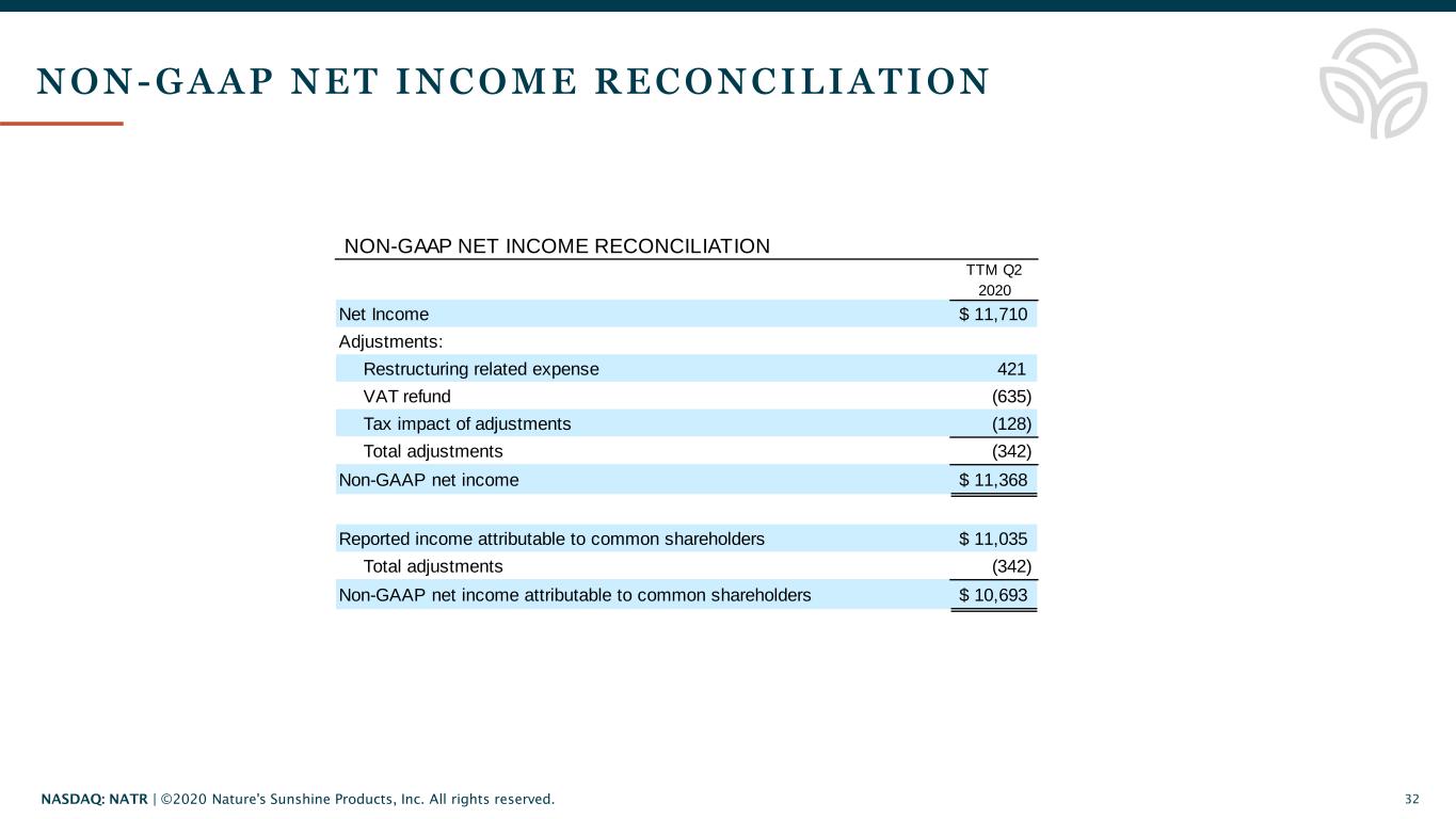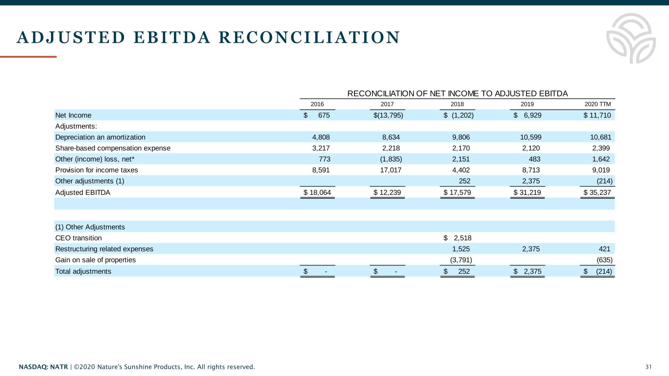NASDAQ: NATR | ©2020 Nature's Sunshine Products, Inc. All rights reserved. 31 A DJU S TED EB I TDA R EC ON C I L I A TI ON 2016 2017 2018 2019 2020 TTM Net Income $ 675 $(13,795) $ (1,202) $ 6,929 $ 11,710 Adjustments: Depreciation an amortization 4,808 8,634 9,806 10,599 10,681 Share-based compensation expense 3,217 2,218 2,170 2,120 2,399 Other (income) loss, net* 773 (1,835) 2,151 483 1,642 Provision for income taxes 8,591 17,017 4,402 8,713 9,019 Other adjustments (1) 252 2,375 (214) Adjusted EBITDA $ 18,064 $ 12,239 $ 17,579 $ 31,219 $ 35,237 (1) Other Adjustments CEO transition $ 2,518 Restructuring related expenses 1,525 2,375 421 Gain on sale of properties (3,791) (635) Total adjustments $ - $ - $ 252 $ 2,375 $ (214) RECONCILIATION OF NET INCOME TO ADJUSTED EBITDA